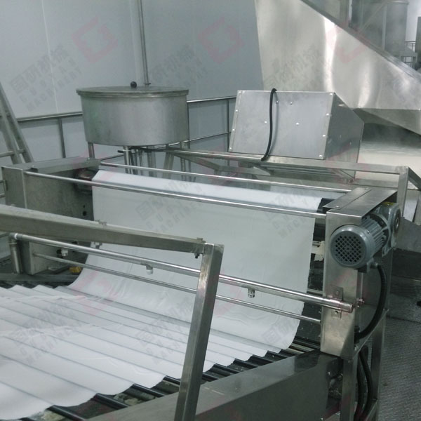蒸片式面皮生产线采用涂布蒸片式生产工艺, 该生产线运行平稳可靠、操作简便、自动化程度高、噪音低、安全性能好,生产出产品复水性好,开水冲泡4分钟即可食用,产品可煮食,不糊汤,韧劲足。